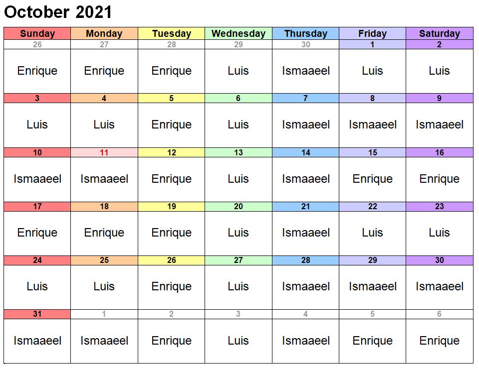 Oct 2021 IT Palm Spring On Call Schedule 4 years ago Enrique Bravo 1 minute OCT-2021Download #On Call